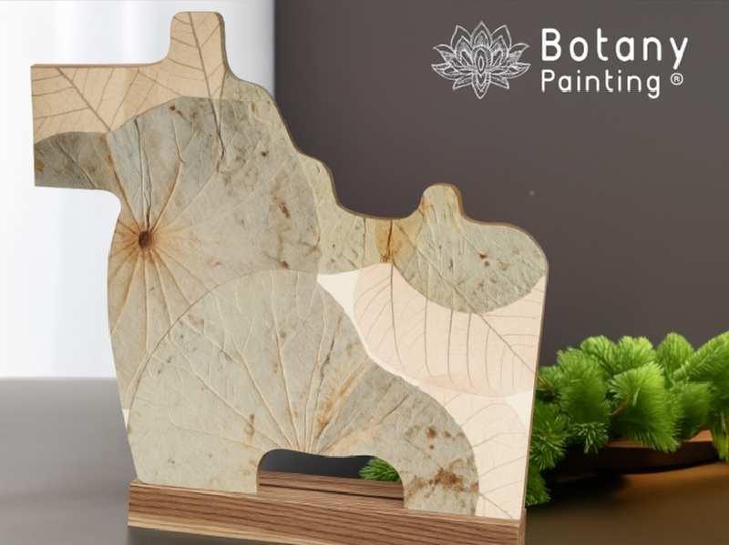 干支パネル(午)に蓮の葉とスケルトンリーフを張り付け、アクリル絵具で着色します。