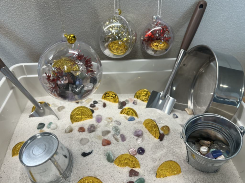砂の中から宝石やメダルを探し出し、オーナメントの中に入れて出来上がり!