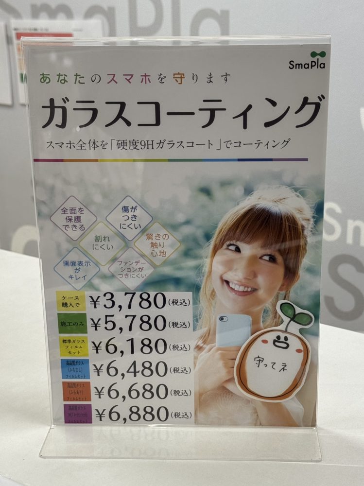 ケータイの画面はガラス素材なので落下や衝撃で割れてしまう事があります。当店では割れ防止対策としてコーティング施行を行っており、さらにフィルムとのお得なセット割も実施中です。ぜひご来店ください!!